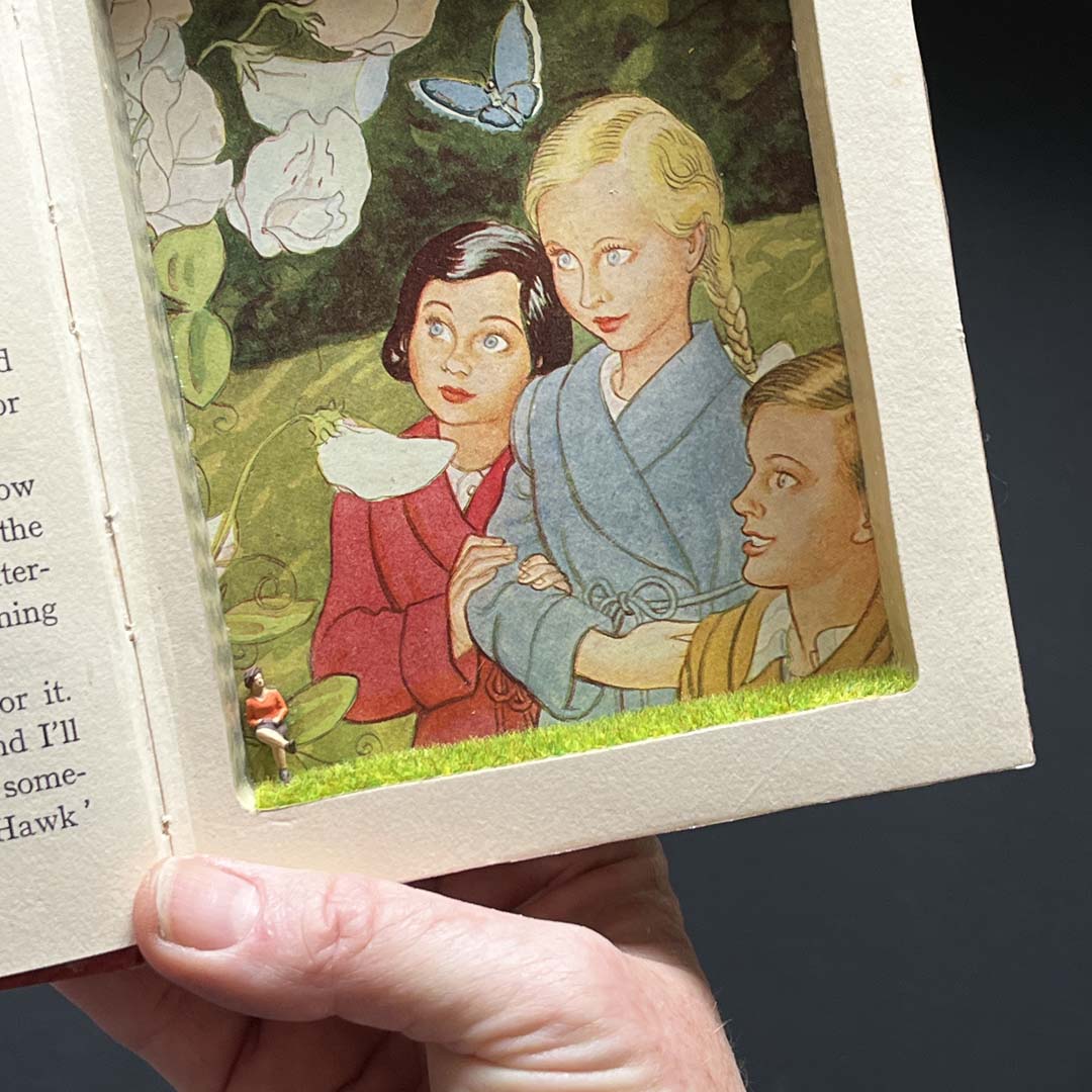 Every Foolhouse booksafe is lovingly carved and glued and enhanced by vintage ribbon bookmarks. Plus a vintage illustration has been specifically chosen to line the secret pocket. The secret message inside is devised by ourselves, inspired by the illustration on show and if well-known – an original quote. There’s even a meadow of faux grass and a wee miniature secret guardian that sneaks up on you and keeps your treasures safe!