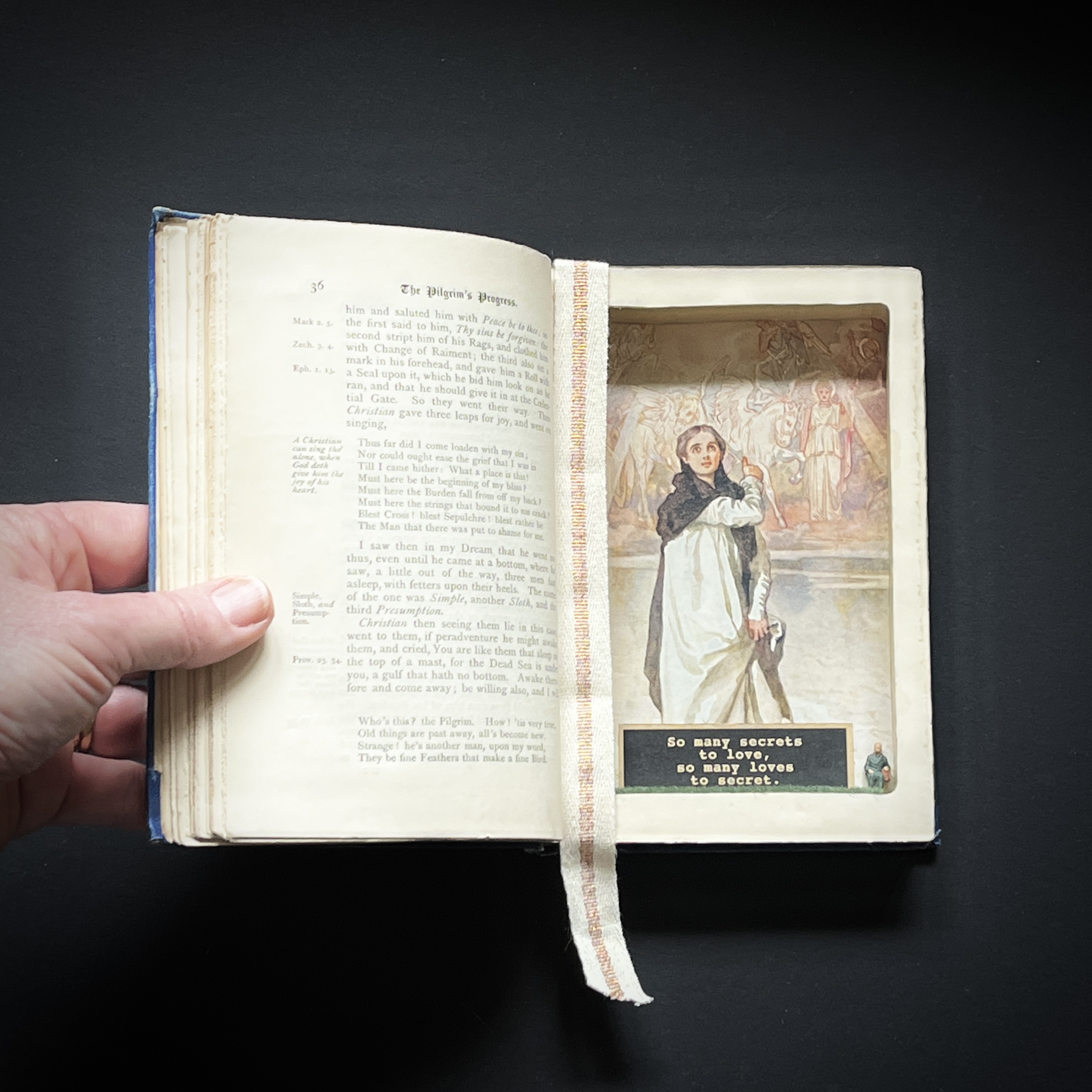 Every Foolhouse booksafe is lovingly carved and glued and enhanced by vintage ribbon bookmarks. Plus a vintage illustration has been specifically chosen to line the secret pocket. The secret message inside is devised by ourselves, inspired by the illustration on show and if well-known – an original quote. There’s even a meadow of faux grass and a wee miniature secret guardian that sneaks up on you and keeps your treasures safe!