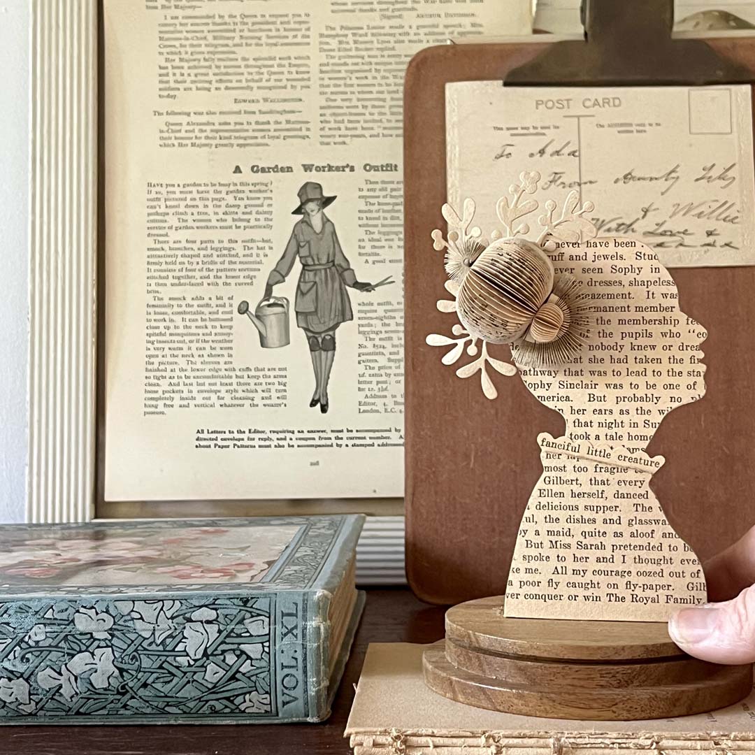 This handmade book sculpture is carved from 210 pages. Each flower and petal is also created from the same book and if you read between the lines on her collar you will find written ‘fanciful little creature’. The perfect gift for a bookish treasured friend or your very own book shelf.