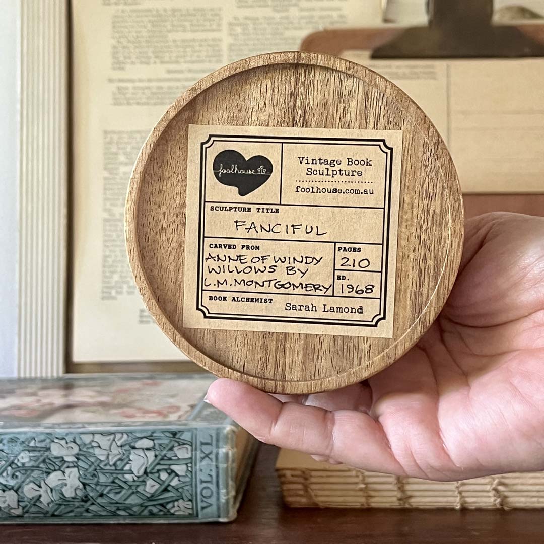 All the information of the book it was carved from is on the base so that its’ history is always kept with it.