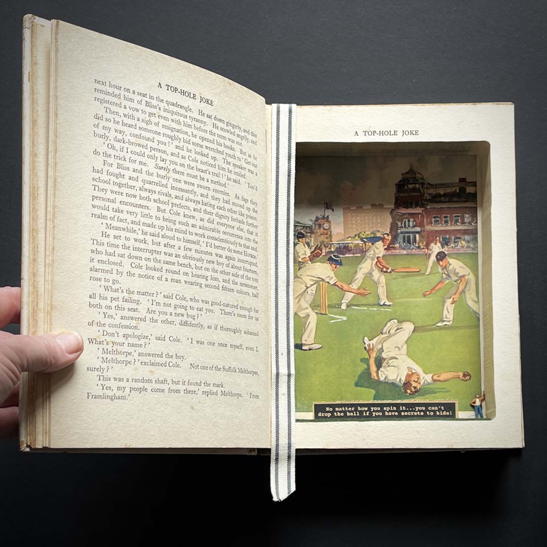 Every Foolhouse booksafe is lovingly carved and glued and enhanced by vintage ribbon bookmarks. Plus a vintage illustration has been specifically chosen to line the secret pocket. The secret message inside is devised by ourselves, inspired by the illustration on show and if well-known – an original quote. There’s even a meadow of faux grass and a wee miniature secret guardian that sneaks up on you and keeps your treasures safe!