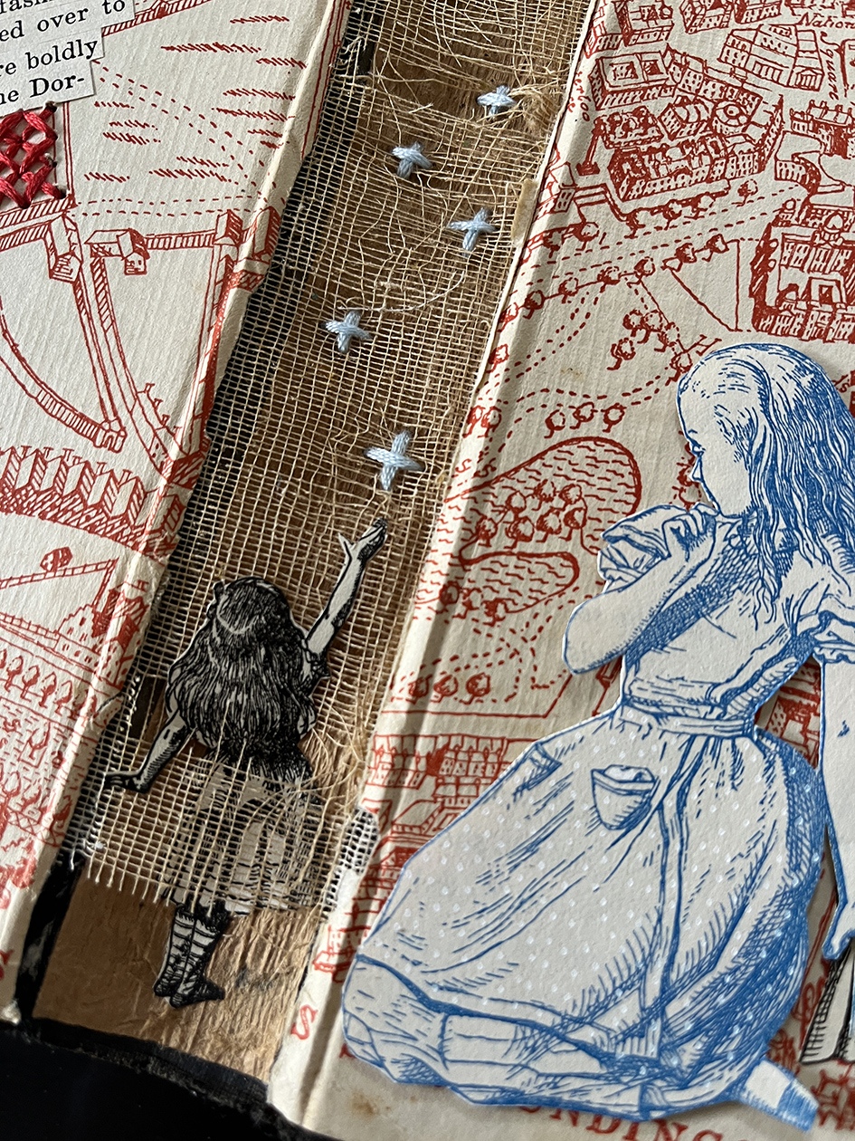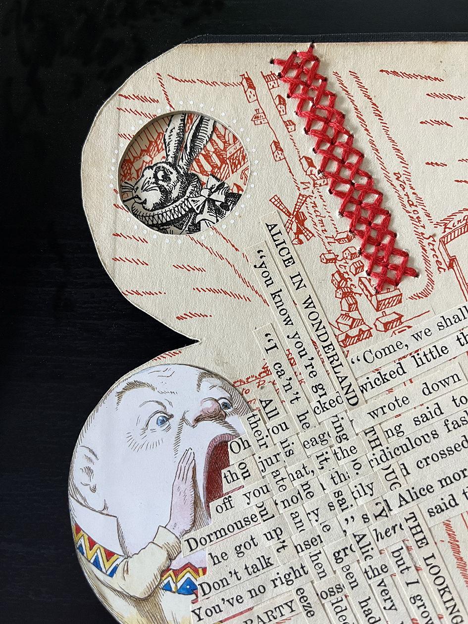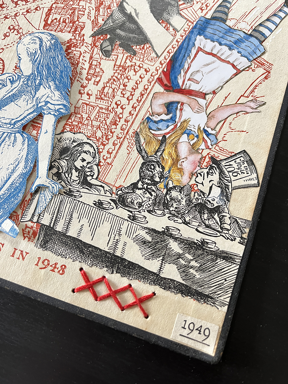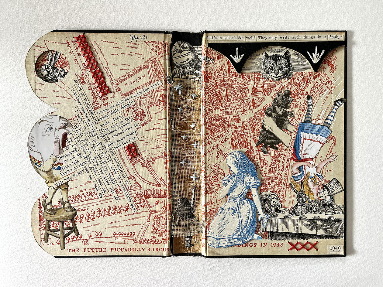 ‘Curiouser’ uses parts of carefully curated illustrations from a variety of vintage Alice in Wonderland books, combined to tell a new story with Lewis Carroll’s words of old. They are integrated into a made-over 1915 vintage book cover called ‘London’ working with the dismantled book to integrate unique handmade details such as stitches using my mother’s vintage sewing box, carefully curated book illustrations and paper weaving. I found amusing sentences amongst the pages that surround me and wove it into a new meaning. It seems only right that it should be celebrated and brought out of books and into the light. A dimensional Wonderland.