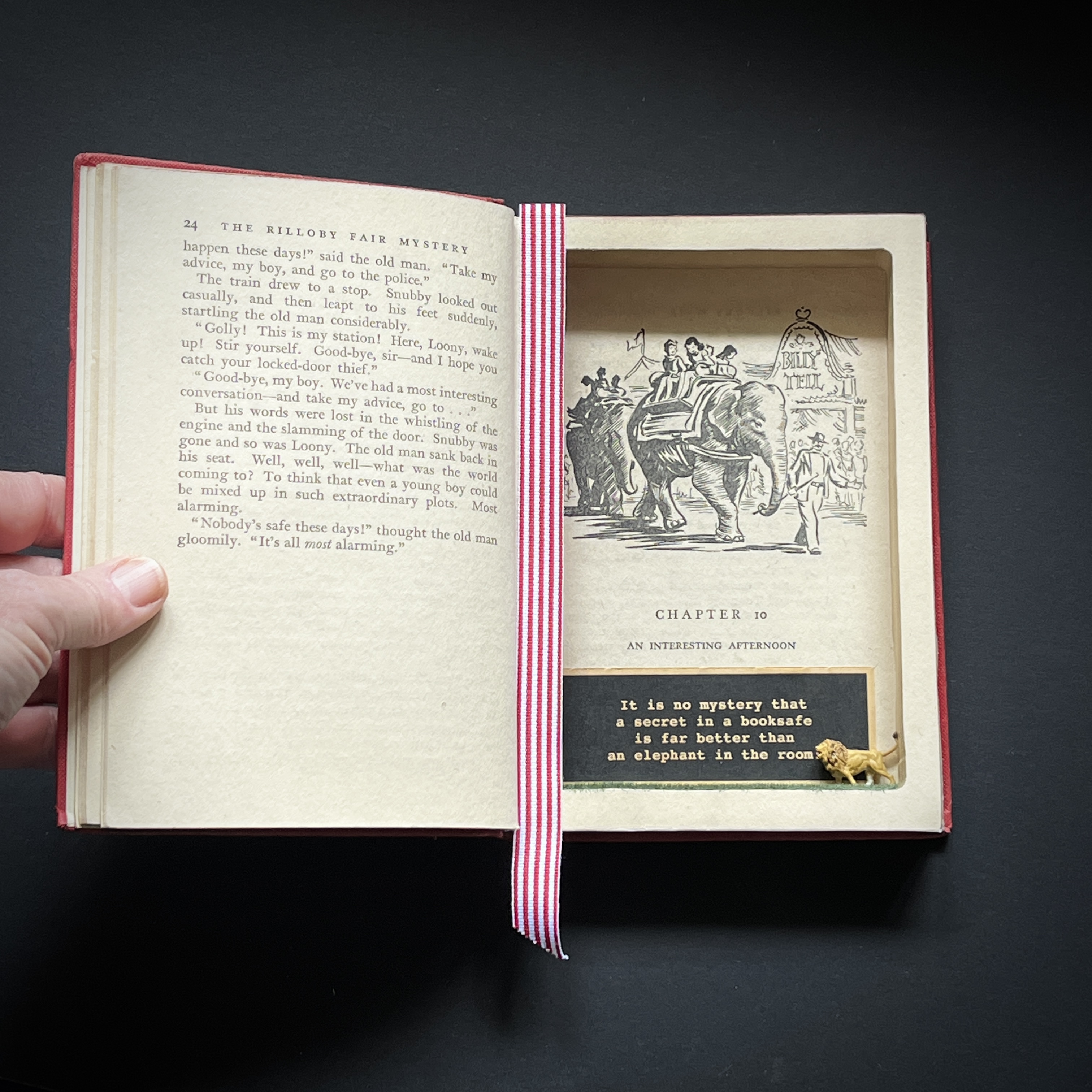 Every Foolhouse booksafe is lovingly carved and glued and enhanced by vintage ribbon bookmarks. Plus a vintage illustration has been specifically chosen to line the secret pocket. The secret message inside is devised by ourselves, inspired by the illustration on show and if well-known – an original quote. There’s even a meadow of faux grass and a wee miniature secret guardian that sneaks up on you and keeps your treasures safe!