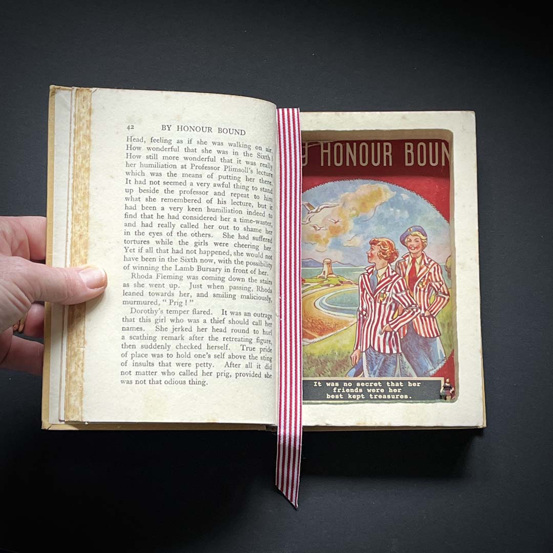Every Foolhouse booksafe is lovingly carved and glued and enhanced by vintage ribbon bookmarks. Plus a vintage illustration has been specifically chosen to line the secret pocket. The secret message inside is devised by ourselves, inspired by the illustration on show and if well-known – an original quote. There’s even a meadow of faux grass and a wee miniature secret guardian that sneaks up on you and keeps your treasures safe!