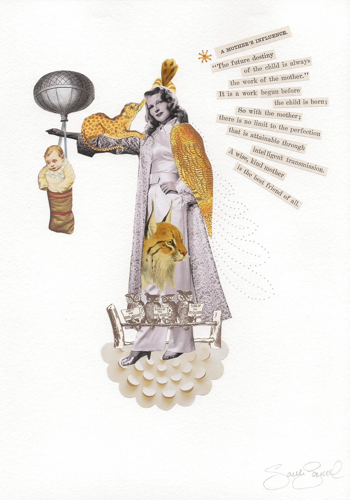 The book was falling apart and beyond redemption for the bookshelf so after reading the 600 page tome, I kept the funniest copy for your amusement and created a main character moment to represent the absurd apparently ‘worldly’ advice. The textural collages are made up of rescued book illustrations, vintage end pages and thread and pin pricks from my mother’s vintage sewing box – all the better to tie the present to the past, or perhaps the past to the present.