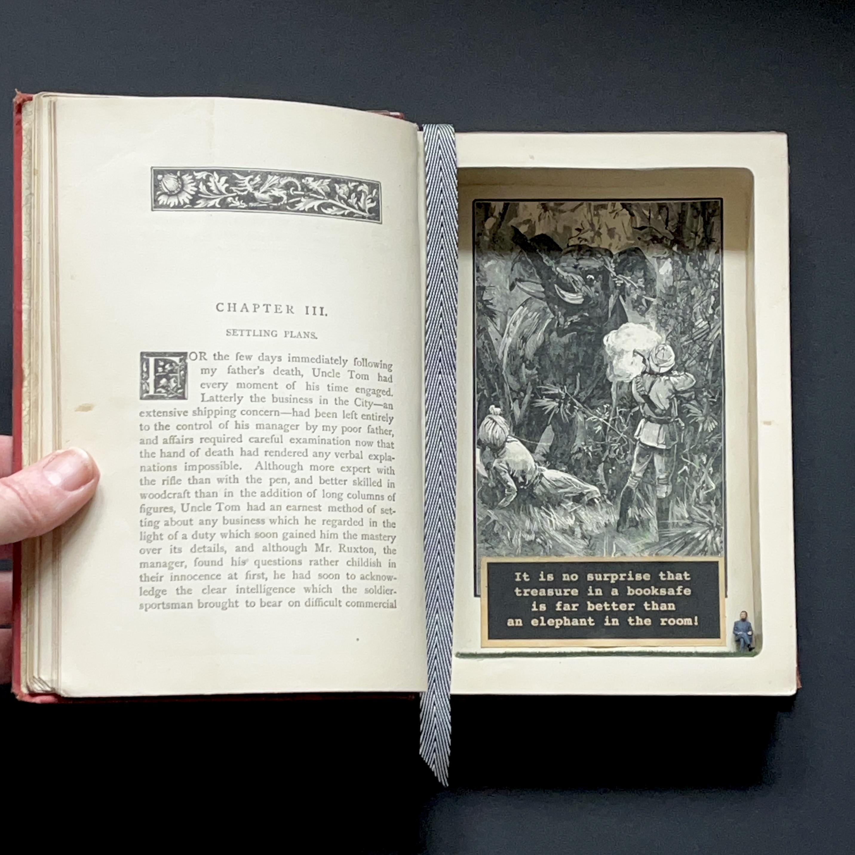 Every Foolhouse booksafe is lovingly carved and glued and enhanced by vintage ribbon bookmarks. Plus a vintage illustration has been specifically chosen to line the secret pocket. The secret message inside is devised by ourselves, inspired by the illustration on show and if well-known – an original quote. There’s even a meadow of faux grass and a wee miniature secret guardian that sneaks up on you and keeps your treasures safe!