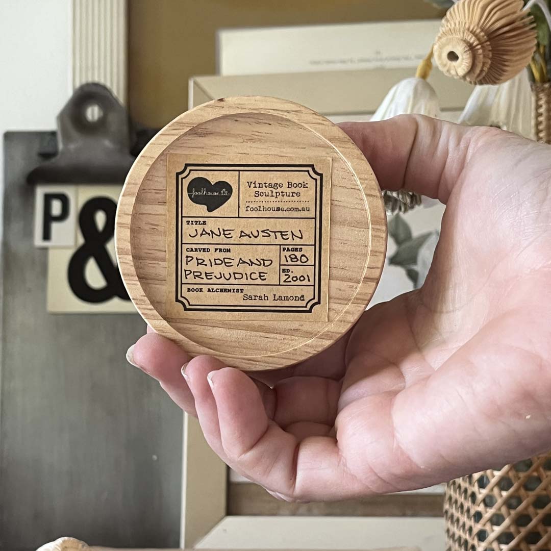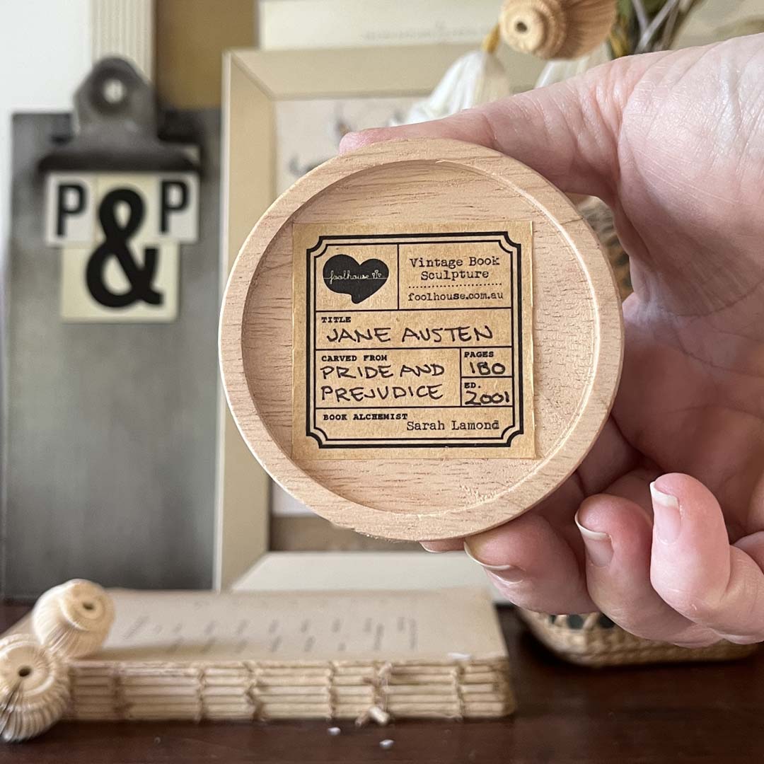 PLEASE WRITE IN THE MESSAGE SECTION WHICH ONE YOU WOULD PREFER. The first photo shows Jane, the second photo thereafter shows what is written on the base of the sculpture and so forth. All the information of the book it was carved from is on the base so that its’ history is always kept with it.