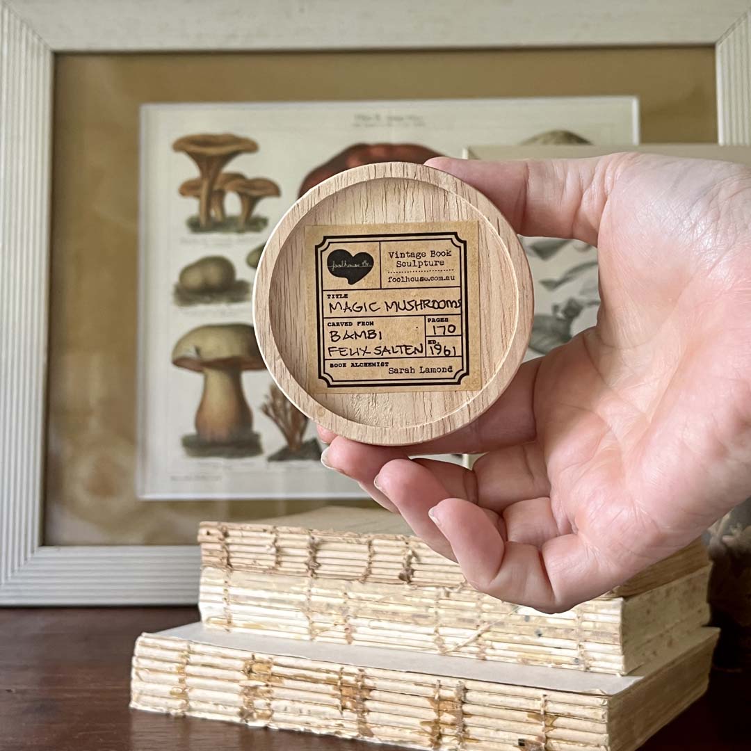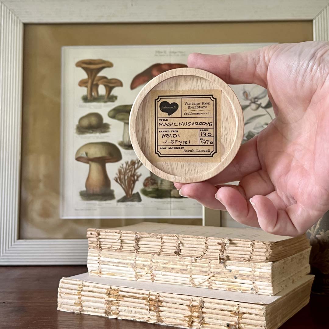 PLEASE WRITE IN THE MESSAGE SECTION WHICH BOOK YOU WOULD PREFER. The first photo shows the mushroom, the second photo thereafter shows what is written on the base of the sculpture and so forth. All the information of the book it was carved from is on the base so that its’ history is always kept with it.