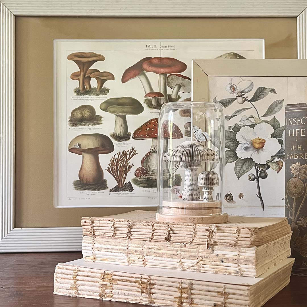 Whether you are a mycophile (a lover of funghi) or simply looking for some creative magic in your life, I have made some sweet umami magic mushroom book sculptures to adorn your bookshelf. This medium size cloche holds 2 carved book mushrooms with a double-sided pale blue butterfly and mushroom inserted between the pages.
