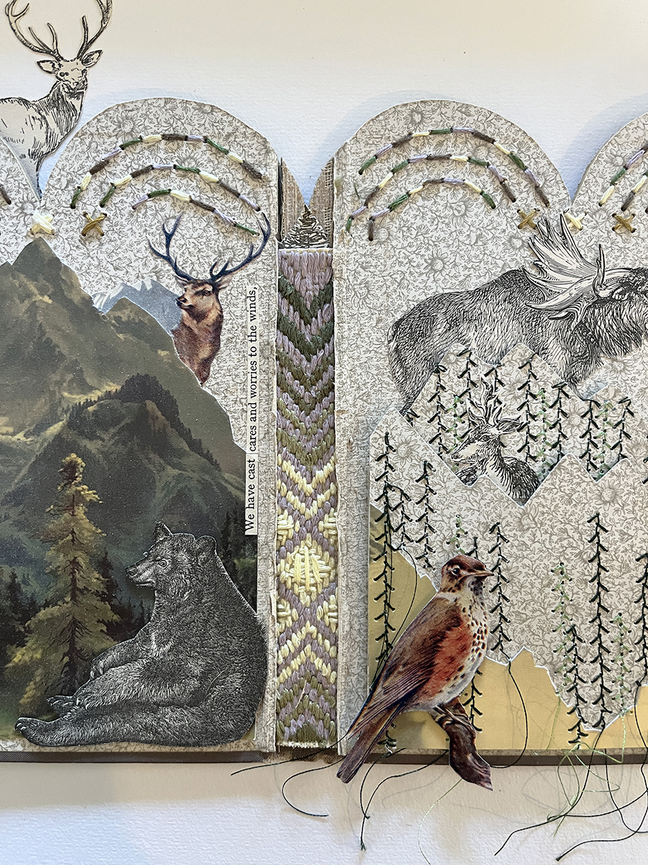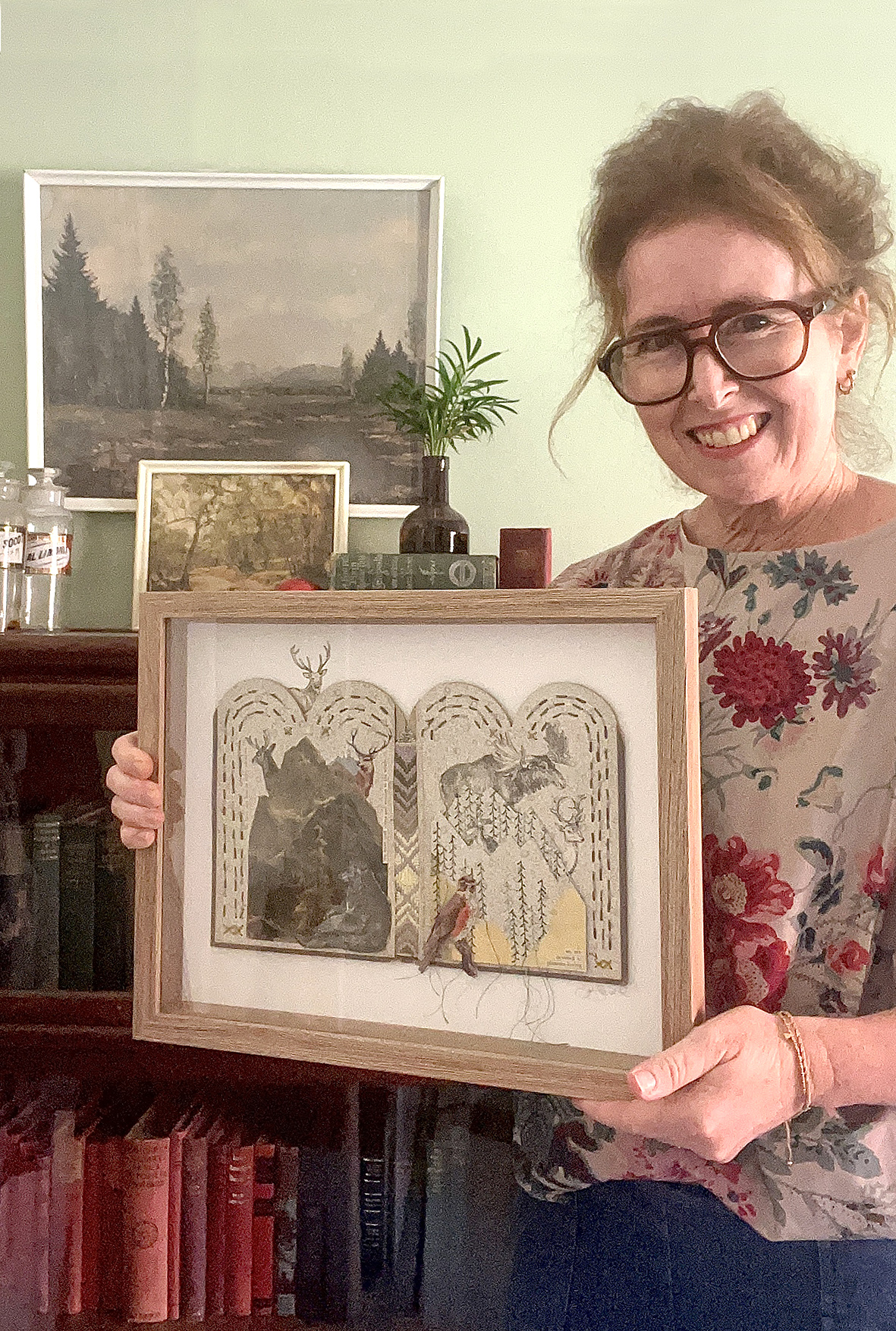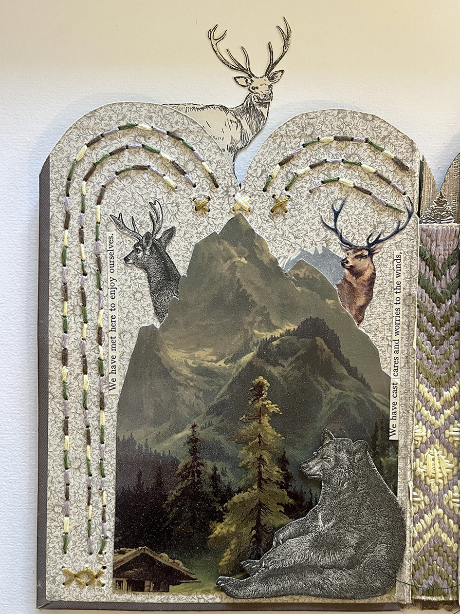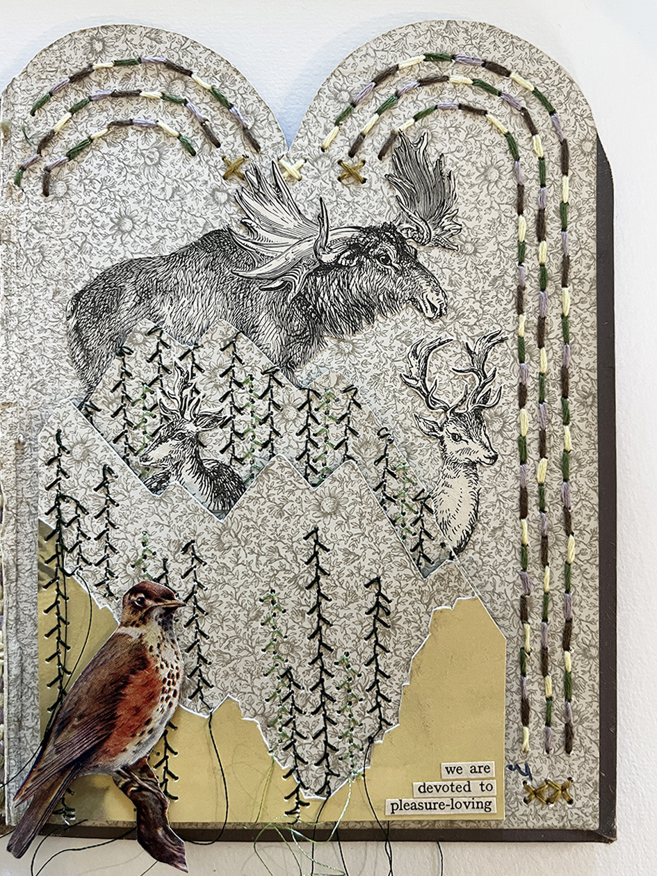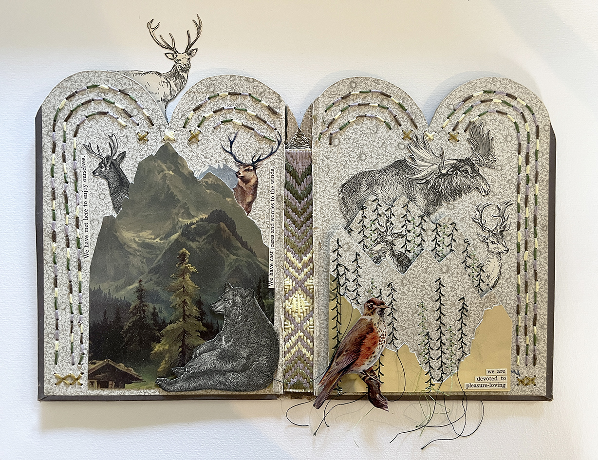 ‘Pleasure Loving’ uses parts of carefully curated illustrations from a variety of vintage books, combined to tell a new story with the words of old. They are integrated into a made-over 1910 vintage book cover called ‘Symbols and Metaphors’ with unique handmade details such as a re-imagined found postcard, needlework to match the coloured landscape, pre-1900 animal etchings and stitched forests on vintage end-papers. I found amusing sentences amongst the vintage stories that surround me and wove it into a new meaning. Often dated and cheeky, the language is so charming and nostalgic that it seems only right that it should be celebrated and brought out of the book and into the light. The sentiment it reveals is poignant.