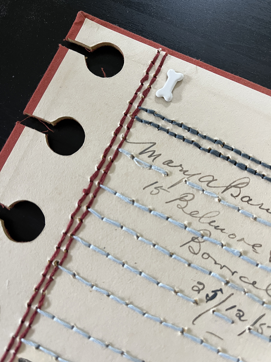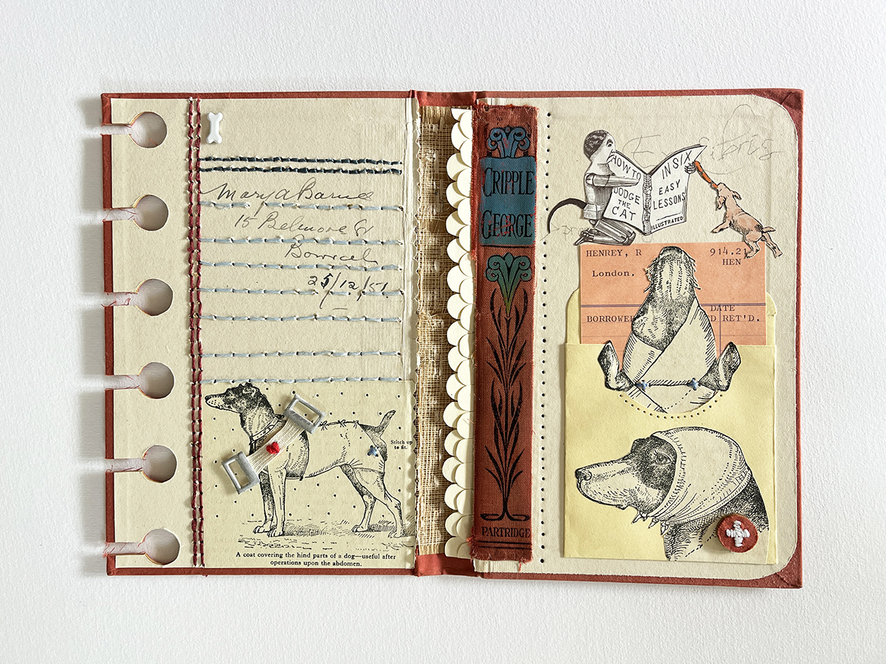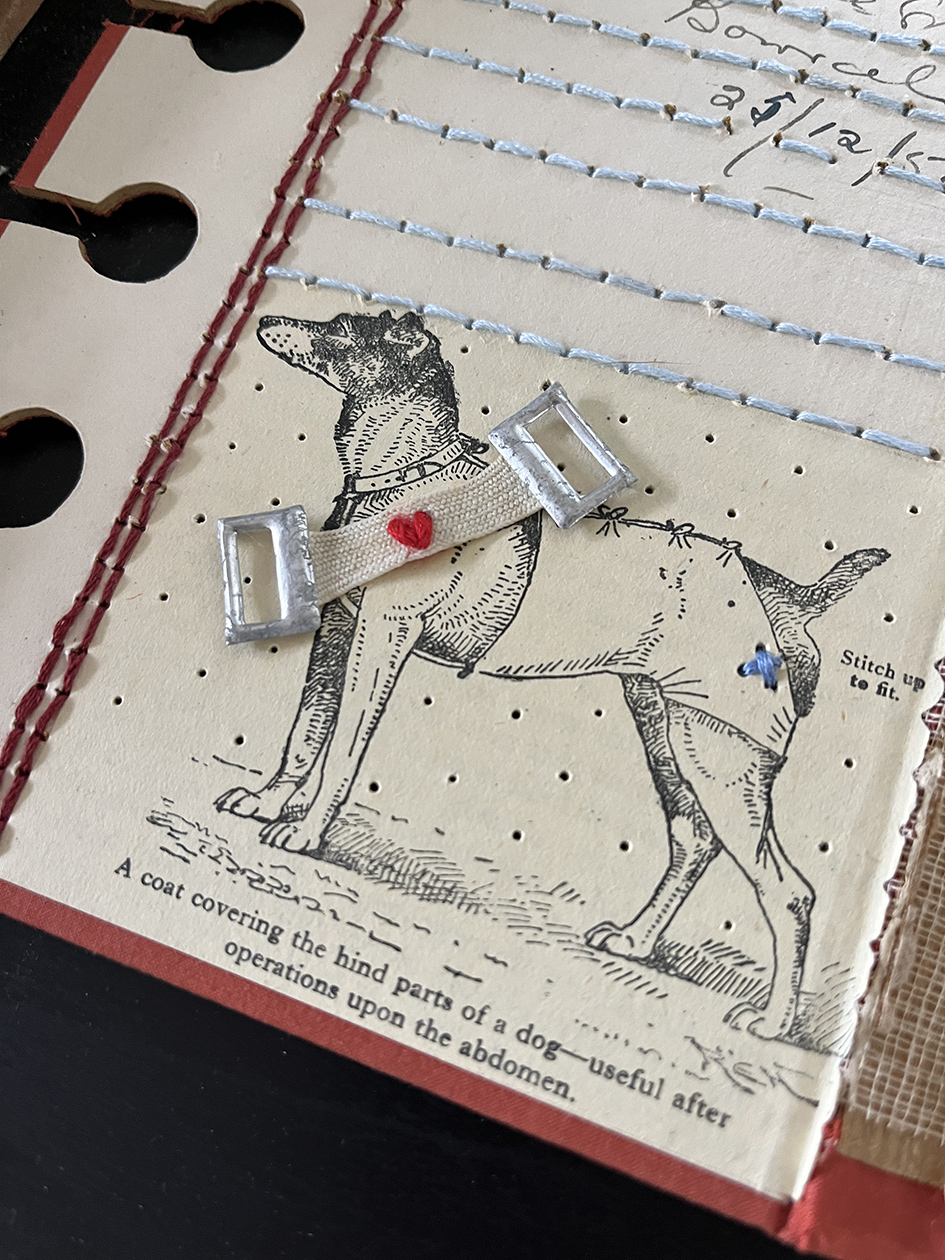 ‘Resilience’ uses parts of carefully curated illustrations from a variety of vintage books, combined to tell a new story with the words of old. They are integrated into a made-over 1908 vintage book cover that has original markings with unique handmade details such as stitches using my mother’s vintage sewing box, carefully curated antique veterinary medical illustrations and antique book spines . The illustrations were so charming I had to construct a tribute to them and their resilient unbreakable nature, yet as fragile as a torn page from a notebook.