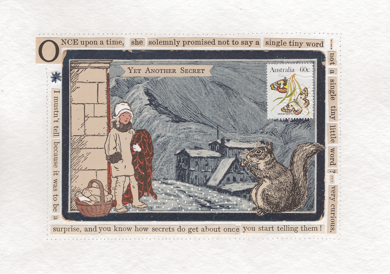 This endearing original A5 Collage uses a fabulous vintage postcard, vintage stamp and text from a 1943 Milly Molly Mandy book by Joyce Lankester Brisley.